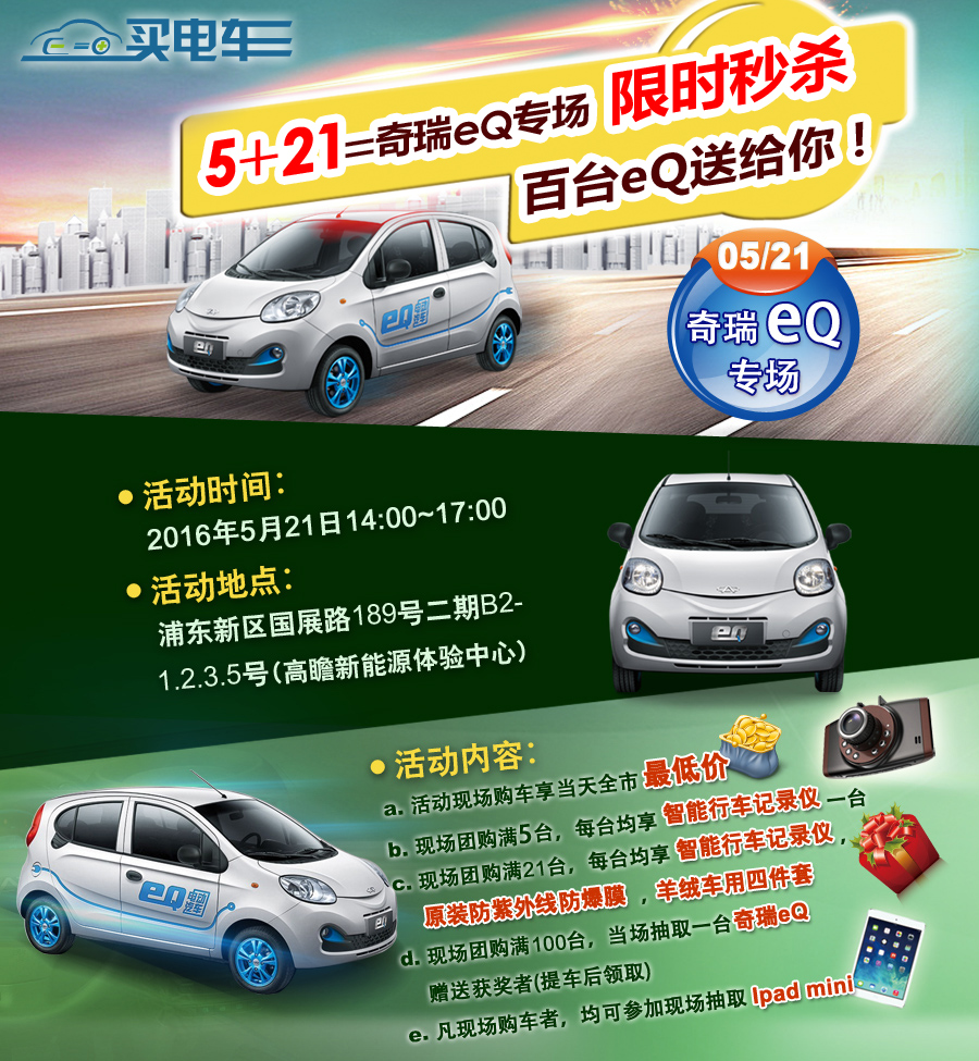 d. 现场团购满100台,当场抽取一台奇瑞eQ赠送获奖者(提车后领取);