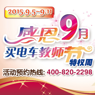 浓情9月,千元大礼包、免费自驾一周、精美礼品等多重惊喜等你来! 粉笔的消失等于老师青春的流逝,没有恩师的用心教导,就没有我们驰骋职场的英姿。正值一年桃李飘香之际,9月5日至9月11日买电车倾情推出教师节特权周活动,为恩师献上超值大礼,感恩他们的辛勤付出。 活动时间:2015年9...