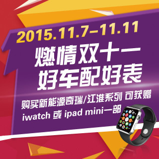 2015.11.7-2015.11.11,买电车“燃情双十一 • 好车配好表”活动让您车+沪牌+iwatch/ipadmini兼得,一次满足3个愿望!